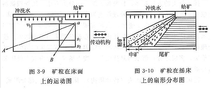 搖床是用于選別細粒礦料的重力選礦設(shè)備。 搖床的選礦過程是在具有來復(fù)條的床面上進行的,礦粒群從床面上角的給礦槽送入,同時由給水槽供給橫向沖洗水,于是礦粒在重力,橫向流水沖力,搖床床面作往復(fù)不對稱運動所產(chǎn)生的慣性和磨擦力的作用下,按比重和粒度分層,并沿搖床床面做縱向運動和沿傾斜床面做橫向運動。因此比重和粒度不同的礦粒沿著各自的運動方向逐漸沿對角線呈扇形流下,分別從精礦端和尾礦側(cè)的不同區(qū)排出,然后被分成精礦,中礦和尾礦。