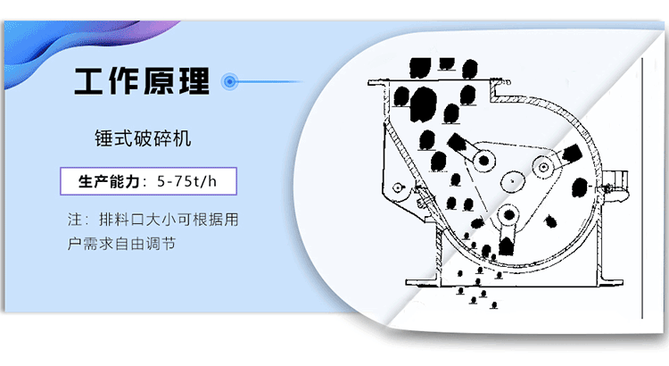 錘式破碎機電動機帶動轉(zhuǎn)子在破碎腔內(nèi)高速旋轉(zhuǎn)。物料自上部給料口給入機內(nèi),受高速運動的錘子的打擊、沖擊、剪切、研磨作用而粉碎。在轉(zhuǎn)子下部,設(shè)有篩板、粉碎物料中小于篩孔尺寸的粒級 通過篩板排出,大于篩孔尺寸的粗粒級 阻留在篩板上繼續(xù)受到錘子的打擊和研磨, 然后通過篩板排出機外。